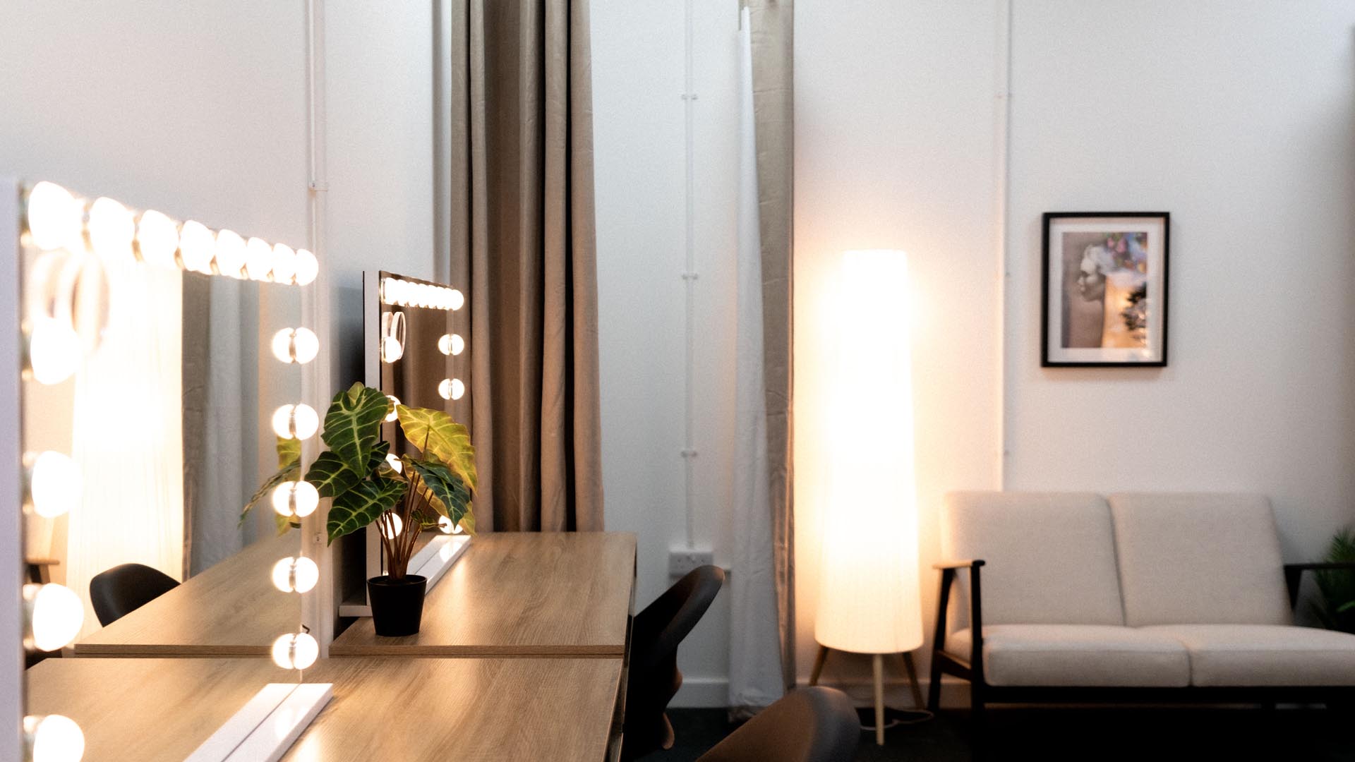 Our spacious green room is located next to both studios with changing booths, makeup stations and clothes rail.